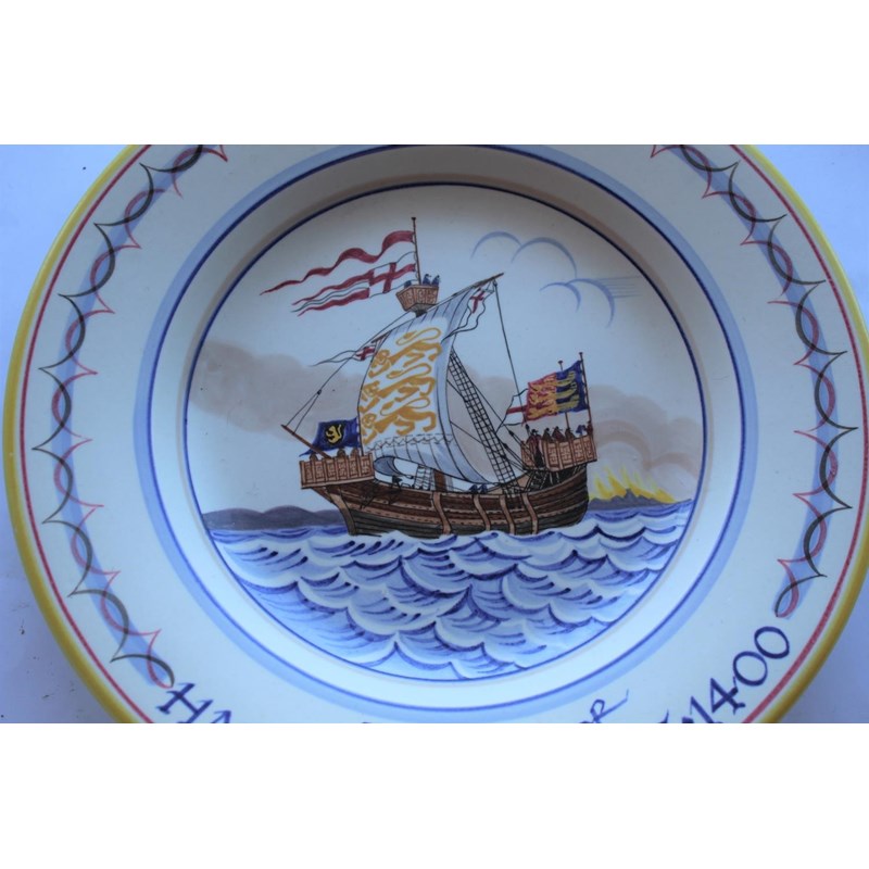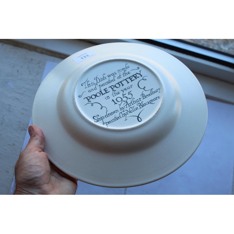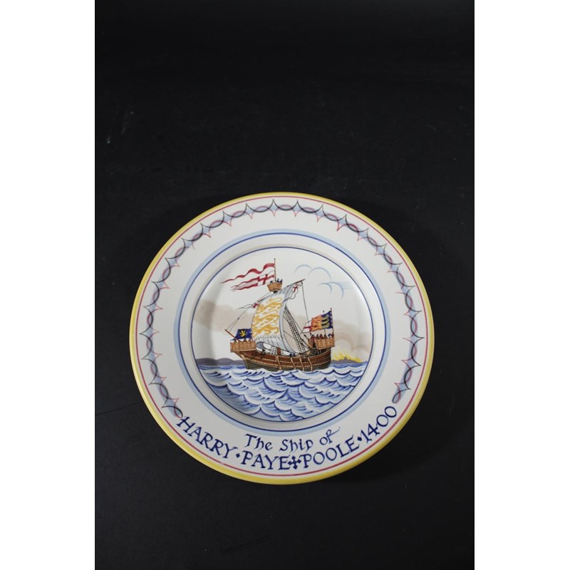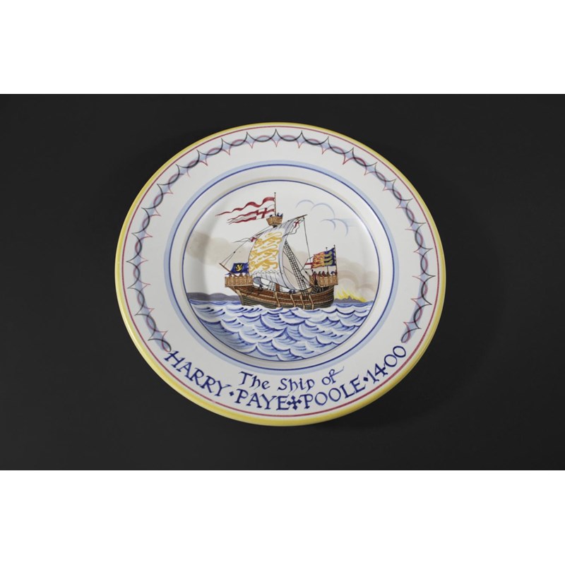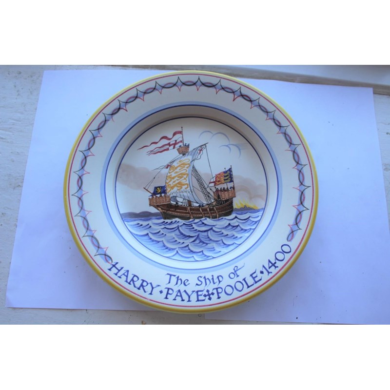 a hand painted dish titled The Ship of Harry Paye, Poole, 1400, painted with the ship at the centre. Marked on the back, This dish was made and painted at the Poole Pottery in the year 1955, Ship drawn by Arthur Bradbury, painted by Nellie Blackmore. 27cms diameter