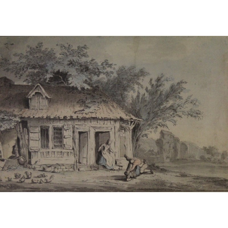 SAMUEL HIERONYMUS GRIMM (1733-1794) MEN FIGHTING OUTSIDE A COTTAGE Signed and dated 1770, further indistinctly inscribed, watercolour 11.5 x 17cm.