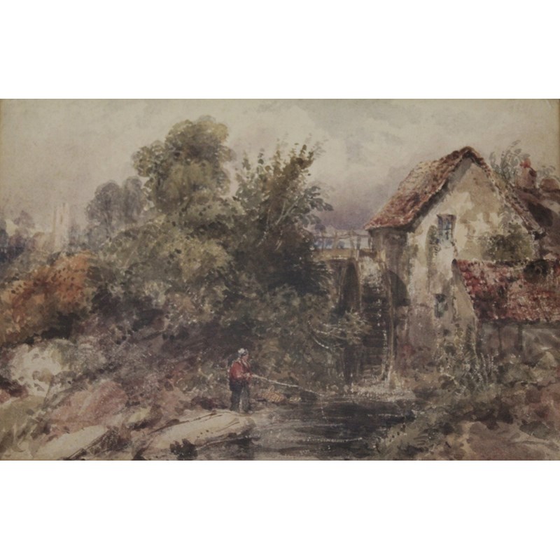 with a watercolour of `Mill near Totnes` by Frederick W. Watts, c.1850, 16.5 x 25cm. (2)