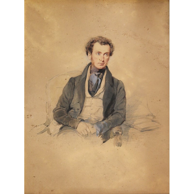 Seated half length, wearing a dark coat, watercolour and pencil sketch