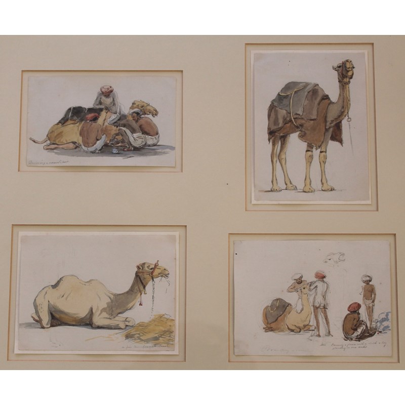 CAMELS: DOCTORING A CAMEL'S FOOT; [DROMEDARY]; A FINE COMMISSARIAT CAMEL; BRANDING A CAMEL - FANNING A FLAME WITH A CLOTH A BOY STANDING ON ONE END