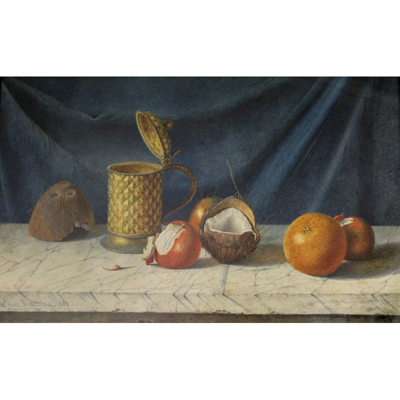 STILL LIFE WITH FRUIT, COCONUT AND A TANKARD; INTERIOR WITH OAK CHAIR AND A COPPER EWER