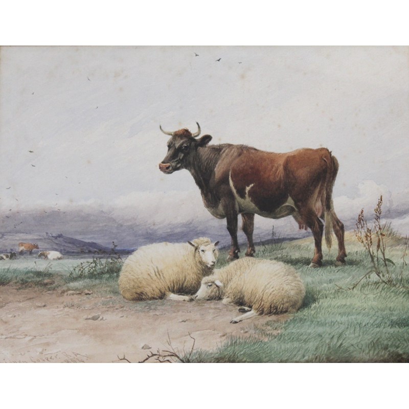 THOMAS SIDNEY COOPER, RA (1803-1902) CATTLE AND SHEEP ON A HEATH Signed and dated 1884, watercolour 24 x 31cm.
