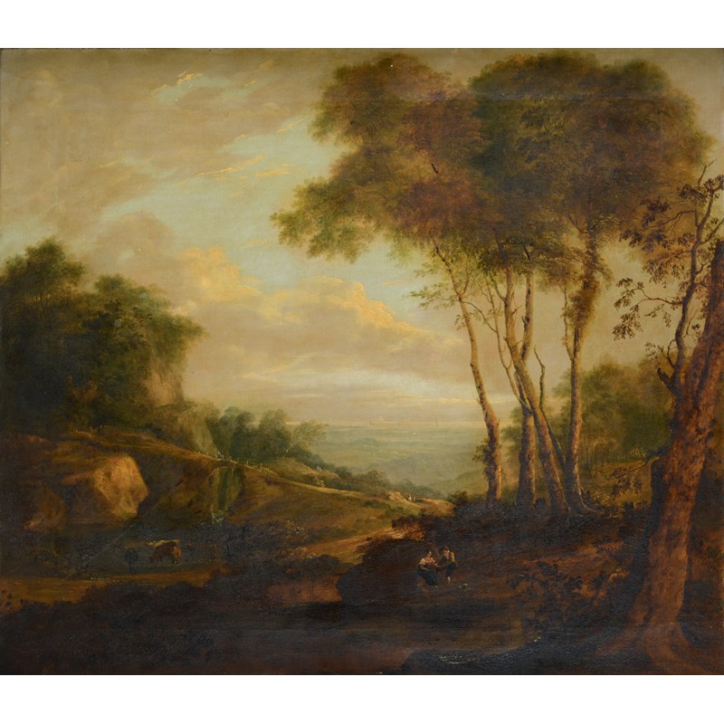 FOLLOWER OF JAMES ARTHUR O'CONNOR (1792-1841) EXTENSIVE LANDSCAPE WITH FIGURES AT THE EDGE OF A WOOD Oil on canvas 83 x 96cm.