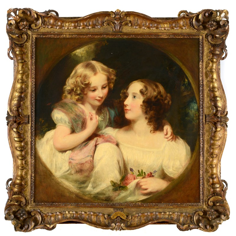 Each wearing white dresses, the younger sibling with a patterned shawl on her shoulder, her sister holding a rose, signed and dated Margaret Carpenter/ 1830, within a painted oval, oil on canvas