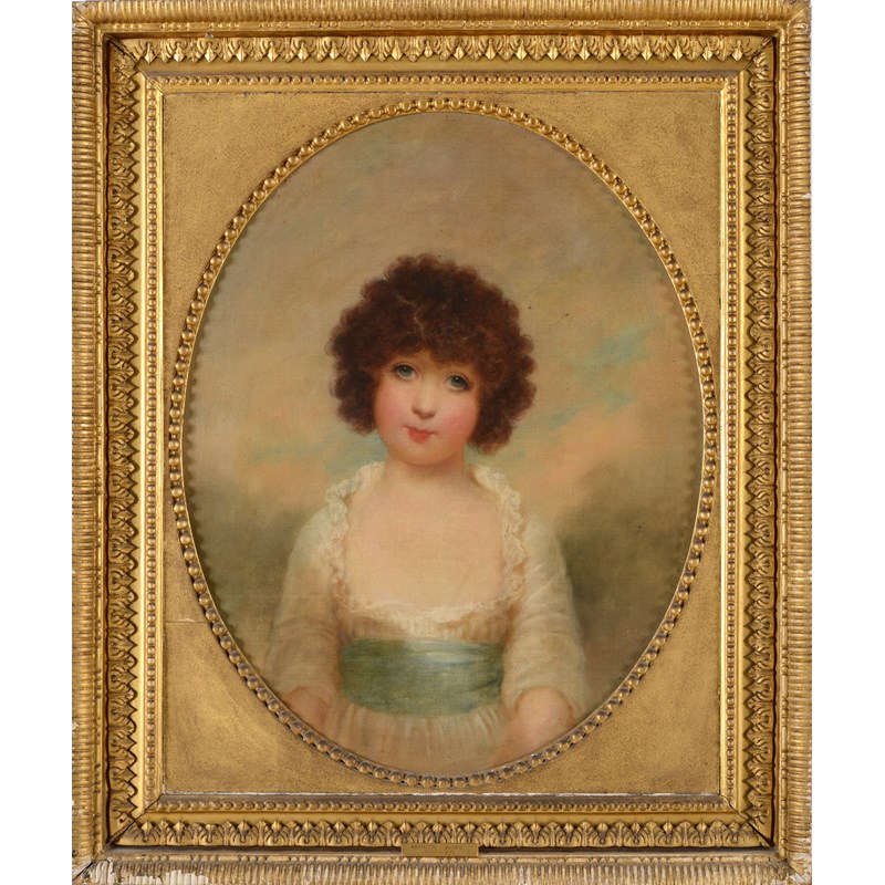 Half length, wearing a white dress with a pale blue sash, oil on canvas, mounted oval