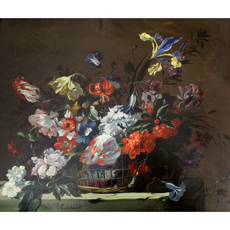 A BASKET OF FLOWERS UPON A STONE LEDGE