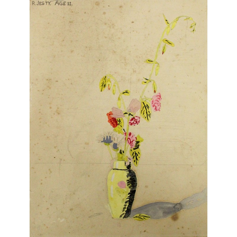 The artist's portable wooden easel, plastic palette, jar of brushes, other artist's materials, the framed diploma recording his election the RBA in June 1982, a few oils on board and a watercolour of flowers in a vase done by him when he was 11 (possibly Jesty's earliest extant work, 28 x 21cm.), a few small watercolours; also thirteen various hardbook books on the practice of watercolour painting (inc. examples to which Jesty contributed illustrations), art magazines, correspondence, photographs, press cuttings, advertisements for exhibitions and some ink cartoons by Margaret Johnson (c.1940) (a lot)