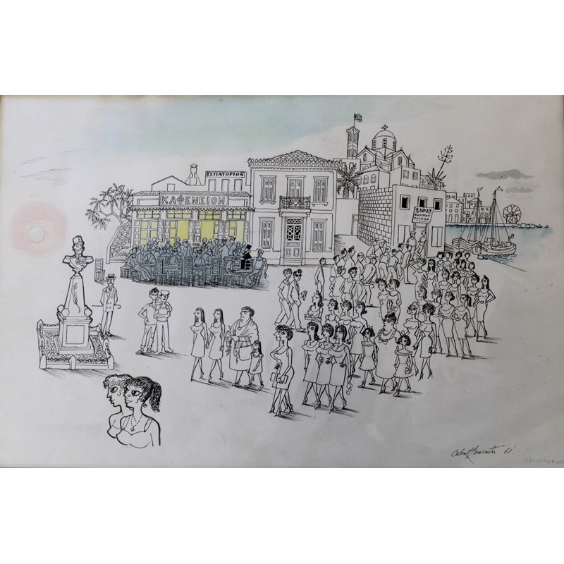 Signed and dated 61, also inscribed RESTAURANT and HOTEL in Greek script, pencil, pen and ink and wash