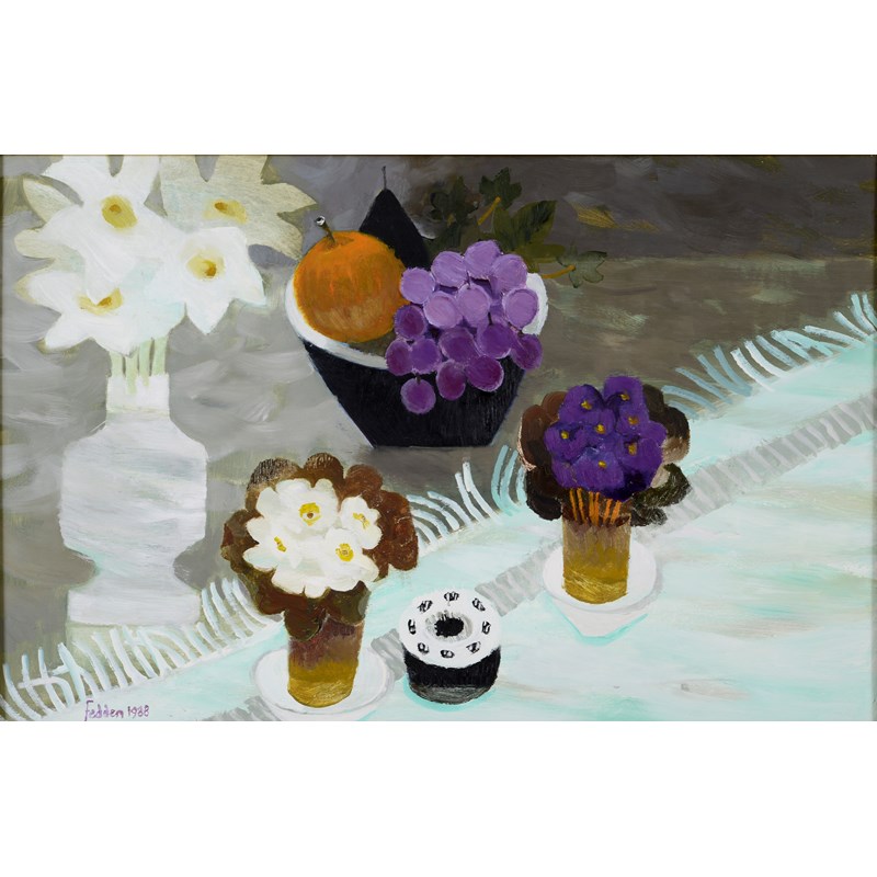 ‡MARY FEDDEN, OBE, RA (1915-2012) STILL LIFE WITH FLOWERS, FRUIT AND A CAKE Signed and dated 1988, oil on ply panel 46.5 x 72cm.