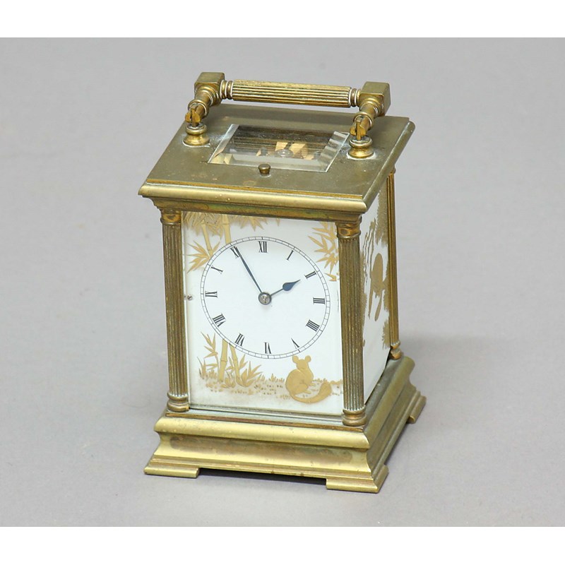 FRENCH BRASS FOUR PANE PORCELAIN MOUNTED CARRIAGE CLOCK,