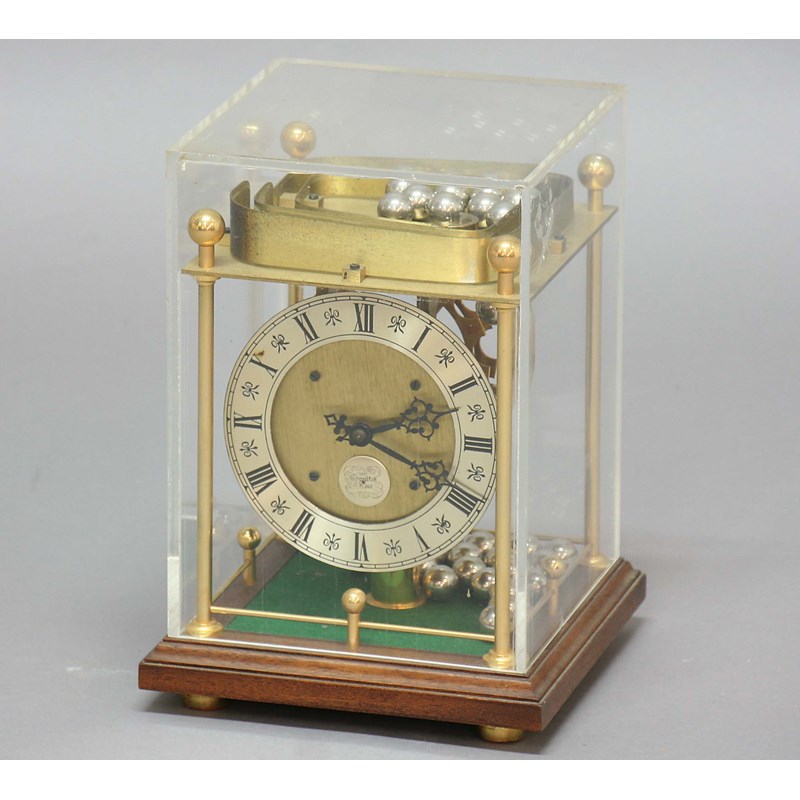 with 5 3/4" silvered dial on a brass movement on four columns supporting the ball 'reservoir', under a perspex case, total height including case and stand 29cm