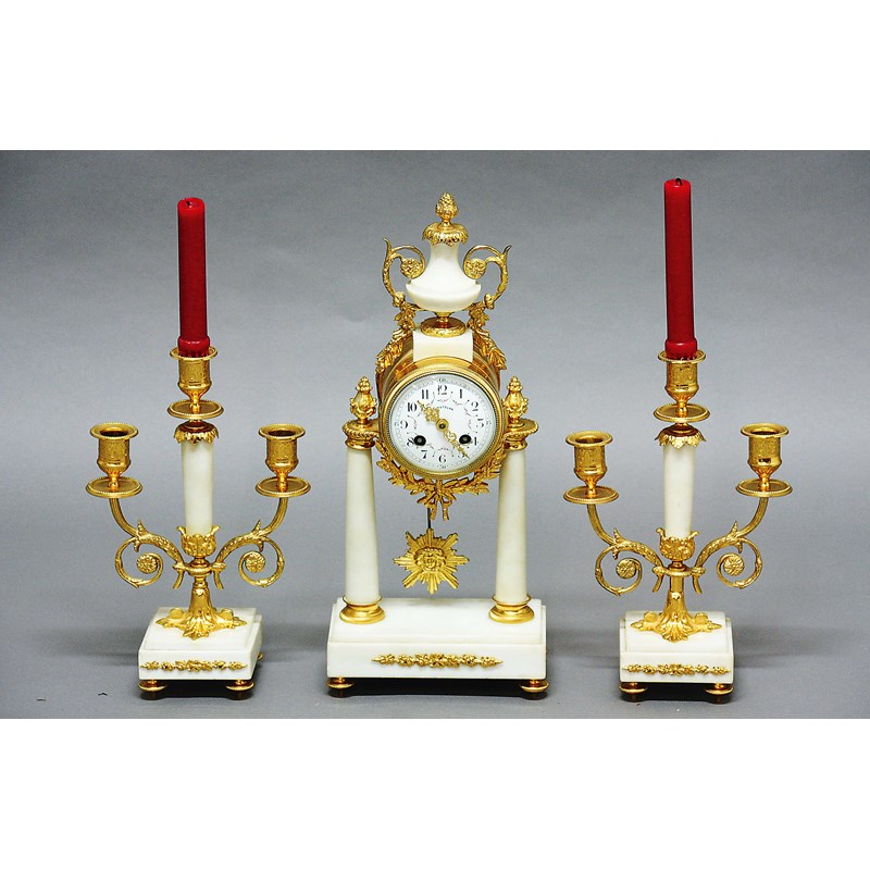 KIEUTZLER WHITE MARBLE AND GILT METAL CLOCK GARNITURE, the enamelled dial with floral swags on a brass movement striking to a bell, beneath an urn finial, with a pair of three light candelabra, height of clock, 43.5cm (3)