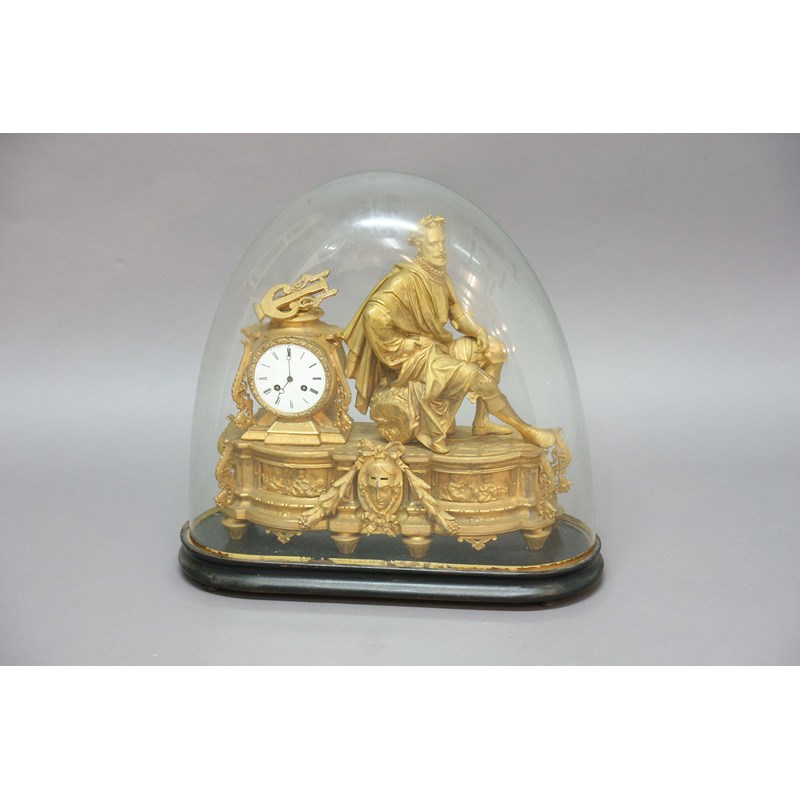 19th century, the 3 1/2" enamelled dial on a brass eight day striking movement, surmounted by a lyre flanked by a gallant seat on a tree stump wearing a cloak and laurel wreath, the base with a swagged mask, under a glass dome, height of clock excluding dome and stand 46cm