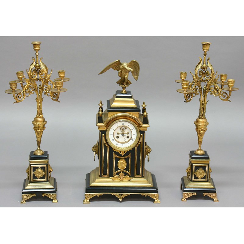 FRENCH EMPIRE STYLE BLACK MARBLE AND GILT METAL CLOCK GARNITURE,