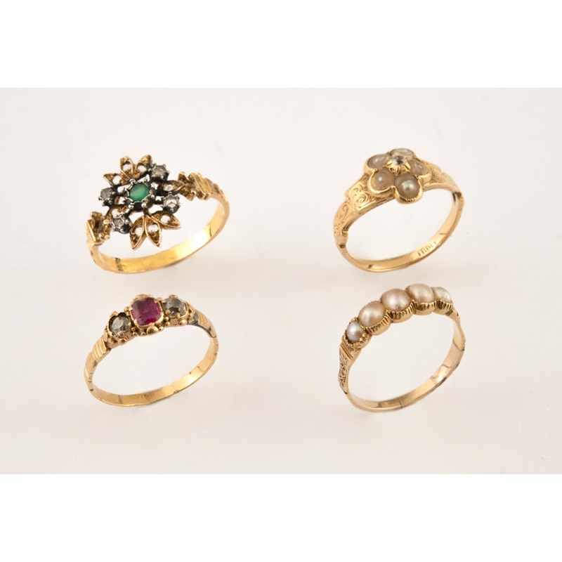 the oval-shaped ruby is set with two rose-cut diamonds in gold closed back setting, size L, together with a Georgian pearl five stone ring, set with five gradated half pearls in gold closed back setting, size K 1/2,