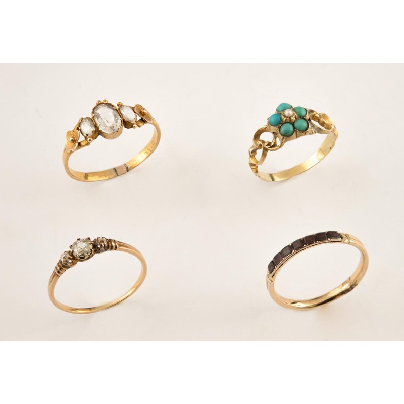 of flowerhead form, with openwork scrolling gold shoulders, size L, together with a diamond three stone ring, set with an old circular-cut diamond and two rose-cut diamonds in gold, size M, a Georgian garnet and gold half hoop ring, size M and a white stone and gold three stone ring, size O 1/2