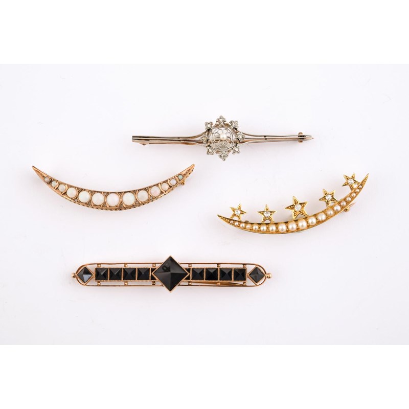 the openwork flowerhead design centred with a small pearl within an openwork surround of rose-cut diamonds, in gold, 6cm long, together with a pearl and diamond set open crescent and star brooch, set in gold, 5cm long, an opal and rose-cut diamond open crescent brooch, set in gold, 5cm long and a black onyx and gold brooch, 6.5cm long