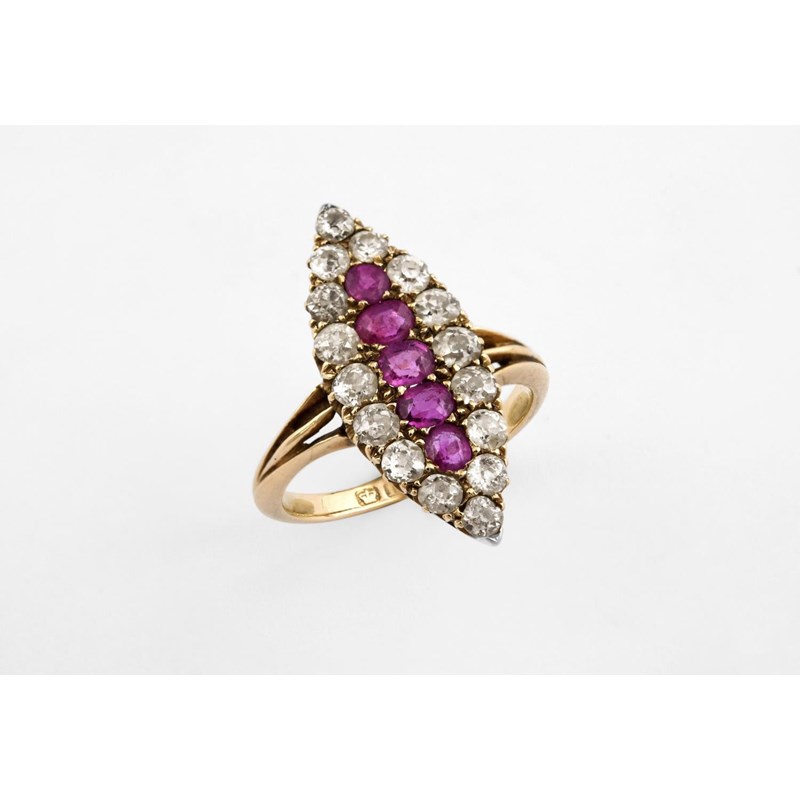 A RUBY AND DIAMOND MARQUISE-SHAPED CLUSTER RING the five rubies are set within a surround of circular-cut diamonds, in 18ct yellow gold. Size J 1/2