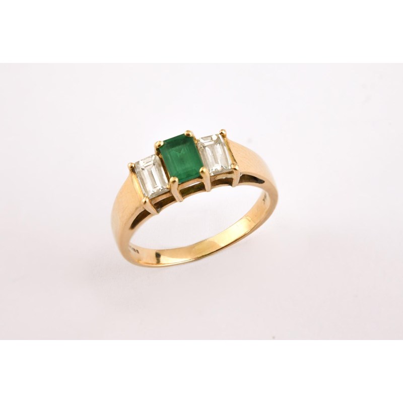 AN EMERALD AND DIAMOND RING the emerald-cut emerald is set with two baguette-cut diamonds in 18ct yellow gold. Size N
