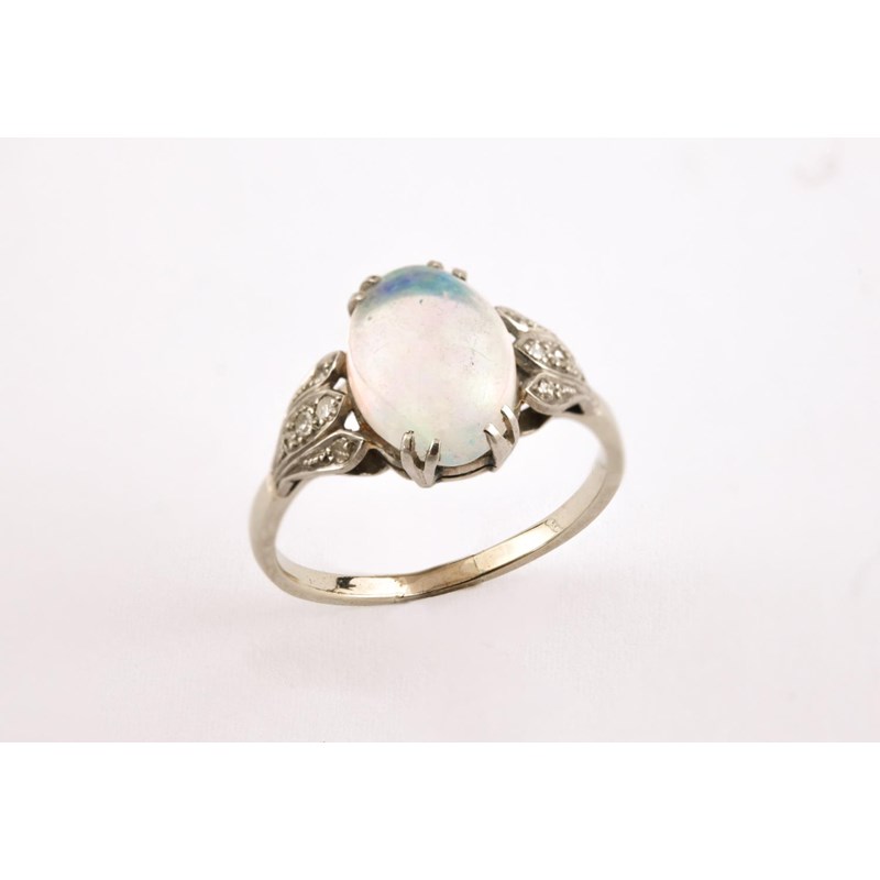 AN OPAL AND DIAMOND RING the oval-shaped white opal is set with single-cut diamonds to each shoulder in 18ct gold and platinum. Size P