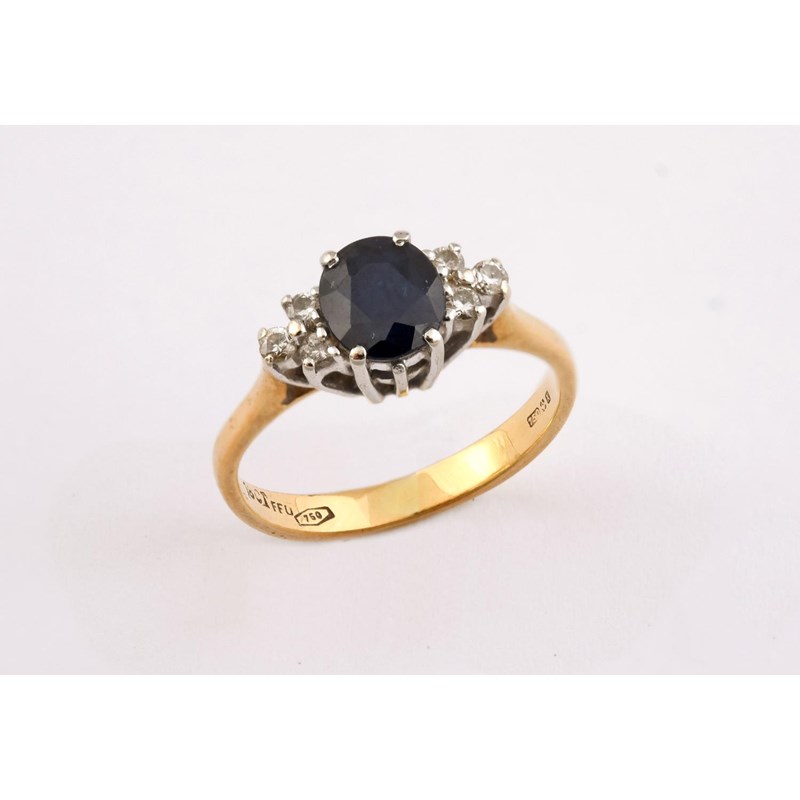 A SAPPHIRE AND DIAMOND RING the oval-shaped sapphire is set with three circular-cut diamonds to each shoulder, in 18ct gold. Size K