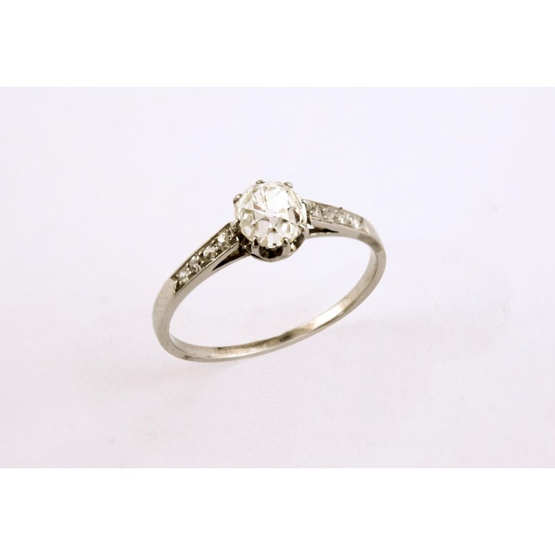 A DIAMOND SOLITAIRE RING the old cushion-shaped diamond is set with four rose-cut diamonds to each shoulder, in platinum. Size L