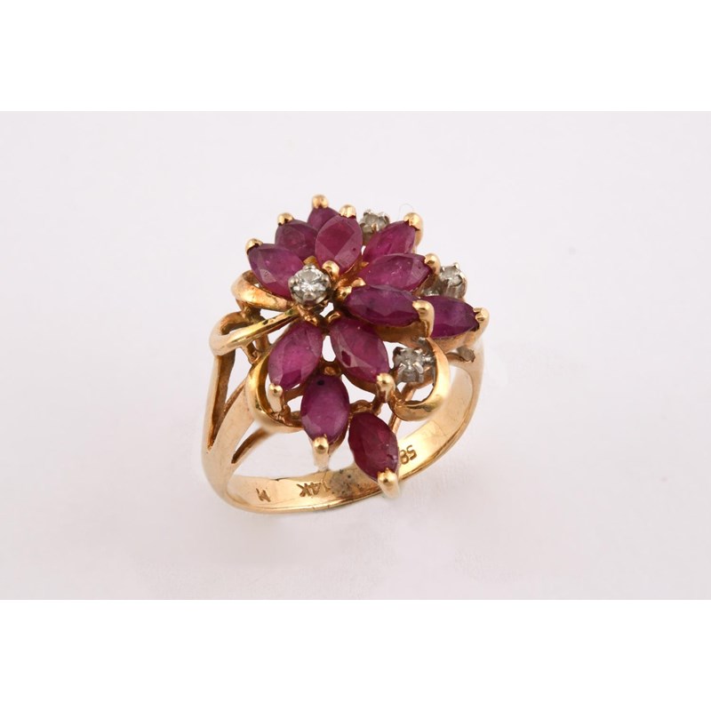 A RUBY AND DIAMOND CLUSTER RING set with circular-cut diamonds and marquise-cut rubies, in yellow gold. Size J 1/2