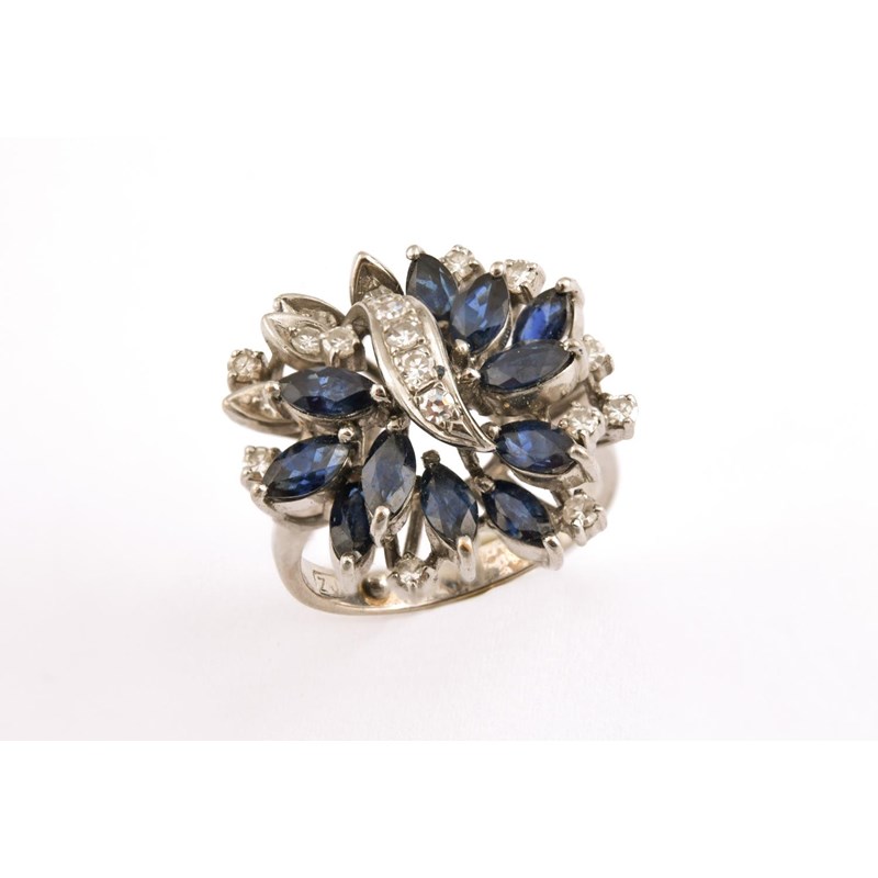 A SAPPHIRE AND DIAMOND CLUSTER RING mounted with marquise-cut sapphires and circular-cut diamonds in white gold. Size L, with re-sizing balls