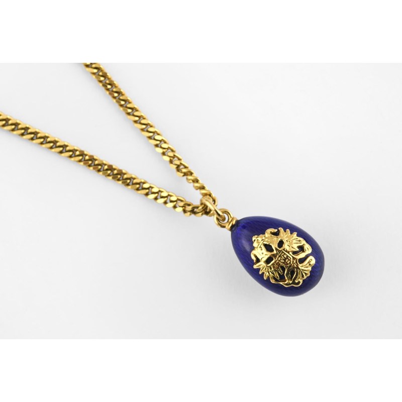 the blue guilloche enamel egg mounted with gold lion mask decoration, limited edition number 114 of 1,000, 2.5cm long including pendant loop, on a 9ct gold neckchain