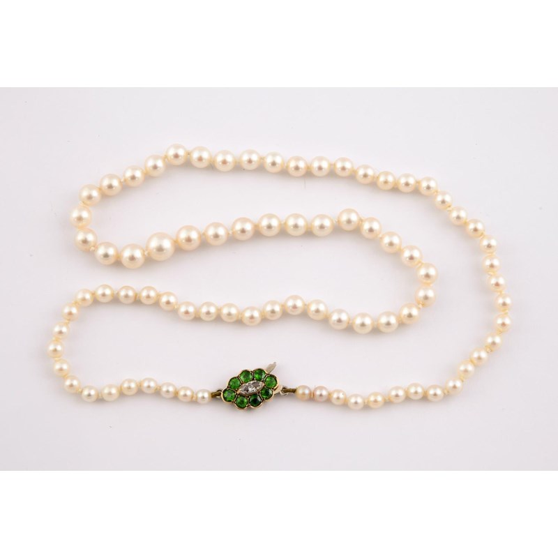 the pearls graduate from approximately 3.9mm to 7.6mm to an oval-shaped gold clasp mounted with marquise-cut diamond within a surround of circular demantoid garnets, 51cm long