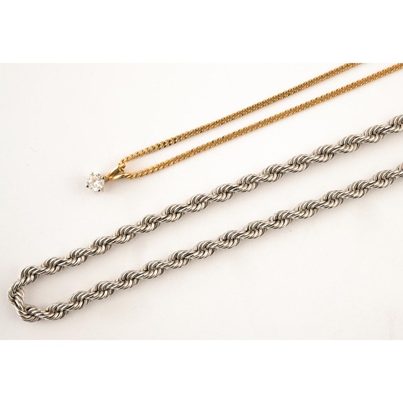 the circular-cut diamond is set in 18ct gold, on an 18ct gold fine link chain, 38.5cm long, together with a 9ct white gold rope link chain necklace, 44.5cm long, 4.2 grams