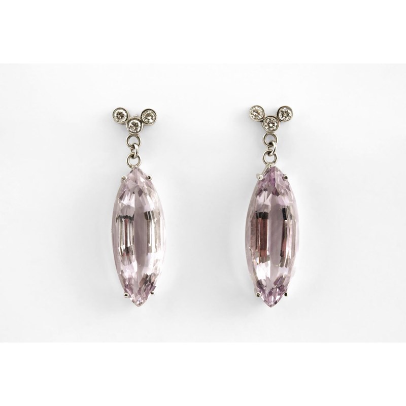 A PAIR OF KUNSITE AND DIAMOND DROP EARRINGS each set with a navette-shaped kunsite with collet set diamond surmount, in white gold, 5cm long