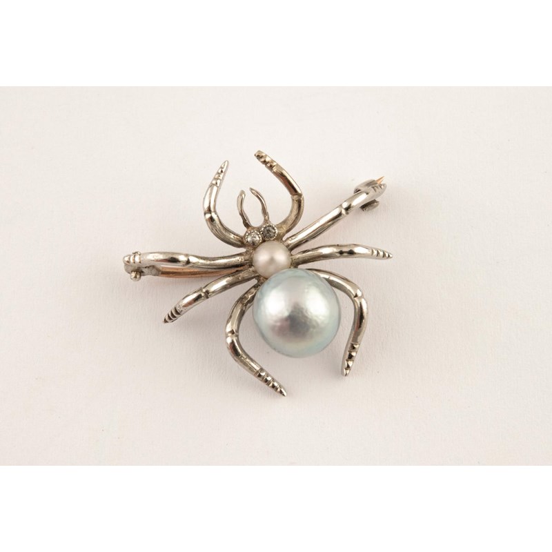 A DIAMOND AND PEARL SPIDER BROOCH mounted with a grey and white cultured pearl, with rose-cut diamond eyes, in gold, 3cm wide