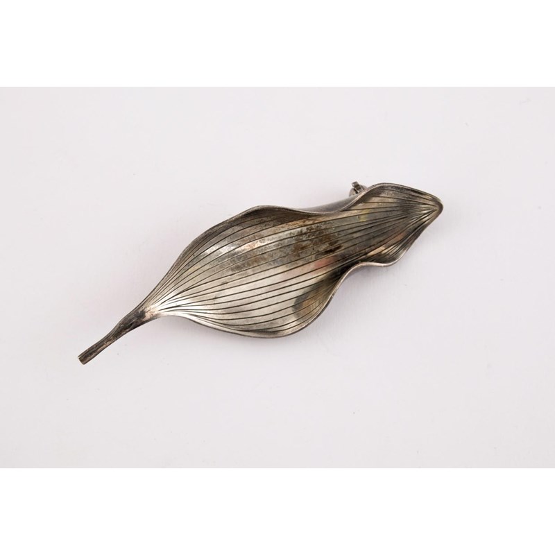 A DANISH SILVER BROOCH in the form of a leaf, stamped Sterling Denmark, with maker's mark AM, possibly for Anton Michelsen, 6.5cm long