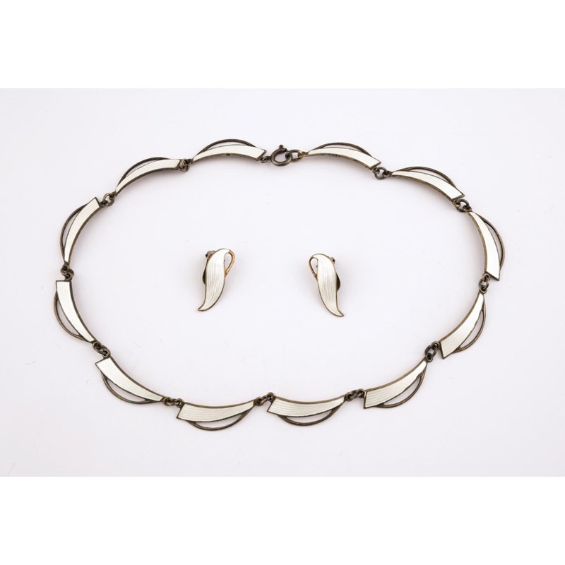 mounted with white enamel in silver gilt, stamped Norway Sterling 925 S to the reverse, 36cm long, together with a pair of matching clip earrings