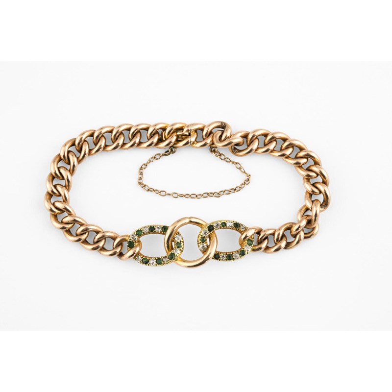 AN EMERALD, DIAMOND AND GOLD CURB LINK BRACELET the curb link bracelet centred with two oval gold sections mounted with circular-cut emeralds and rose-cut diamonds, with concealed clasp, 18cm long, 16.1 grams