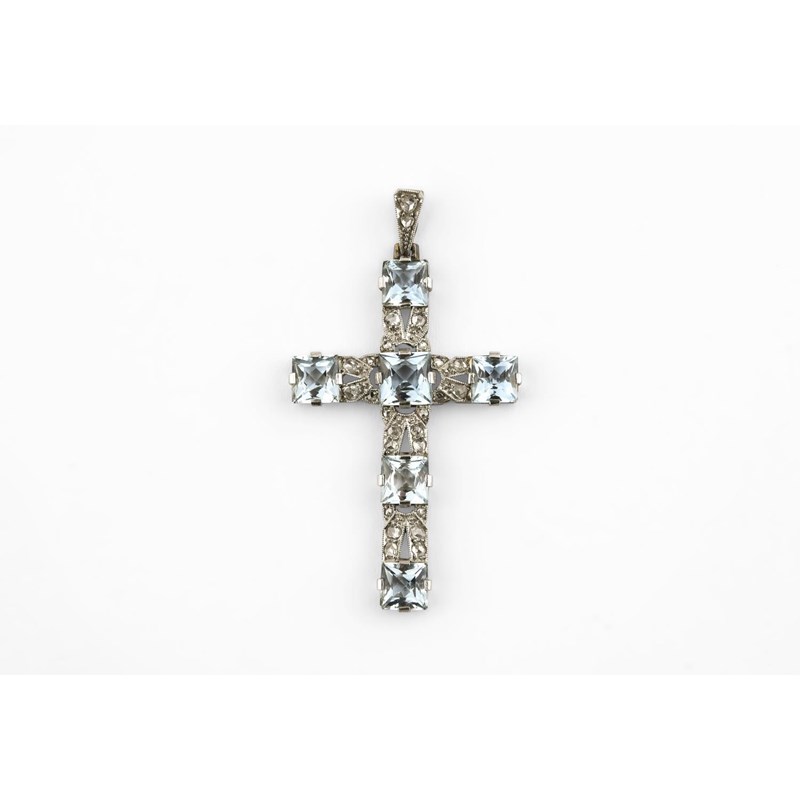 A CONTINENTAL AQUAMARINE AND DIAMOND CRUCIFORM PENDANT the openwork mount set with square-shaped aquamarines and rose-cut diamonds, with Continental marks to the bale, 5.0 x 2.6cm
