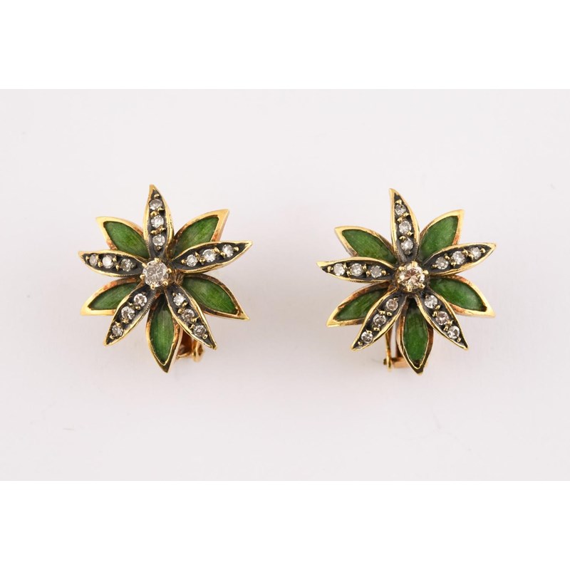 A PAIR OF DIAMOND AND ENAMEL FLOWERHEAD EARRINGS each earring set with circular-cut diamonds, with green enamel leaves, in yellow gold, with post fittings, 2.1cm dia