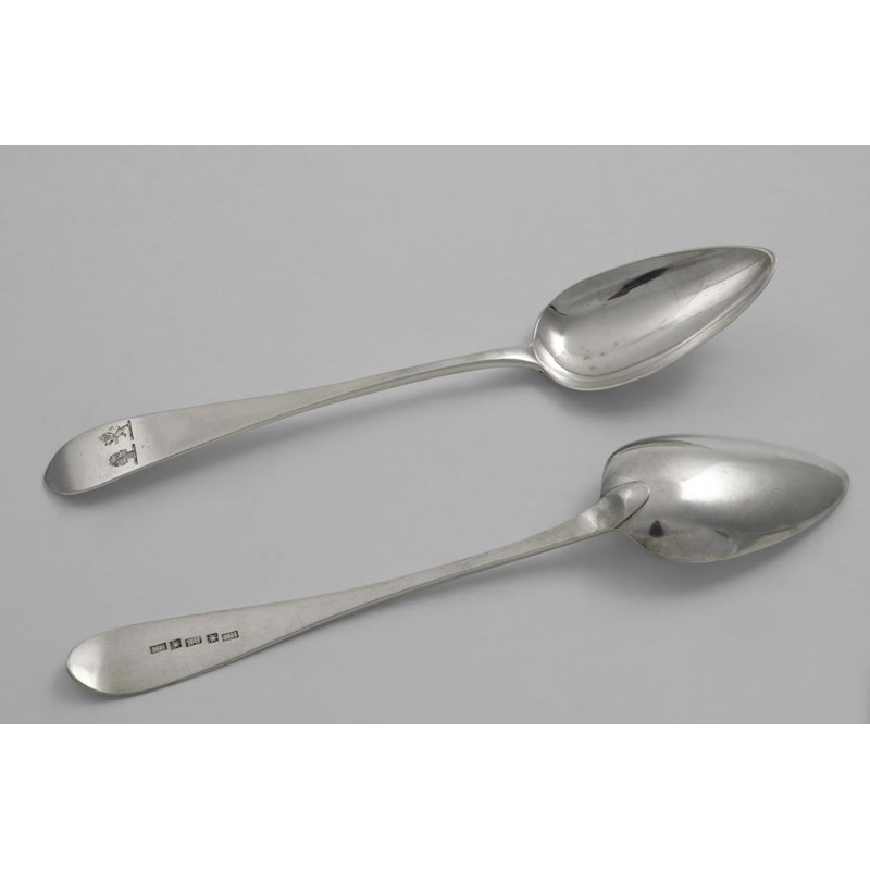 A PAIR OF SCOTTISH PROVINCIAL TABLE SPOONS with "pointed" ends, engraved with two crests, by Robert Keay of Perth (RK, eagle, RK, eagle, RK) c.1840; 3.9 oz (2)