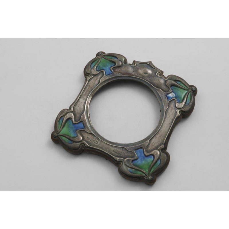 with enamelled decoration in the corners and a hammered finish (no back), by William Hutton & Sons, London 1903; 5.5" (14 cms) square