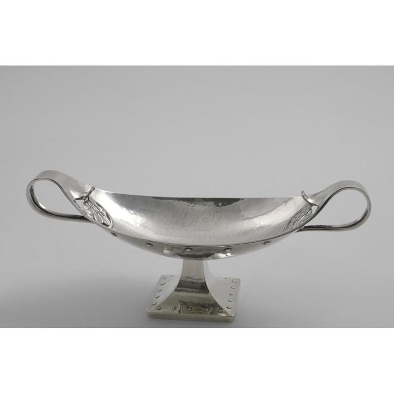 brat-shaped with a square pedestal foot, applied and punched beads to simulate rivets, the bowl pierced at each end with a panel of leaves, by A.E. Jones, Birmingham 1911; 9.7" (24.5 cms) long; 5.8 oz