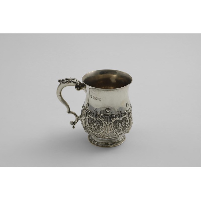 with embossed decoration around the lower body, a vacant cartouche and a leaf-capped scroll handle, by W. Gibson & J. Langman, London 1898; 3.6" (9.2 cms) high; 6.3 oz