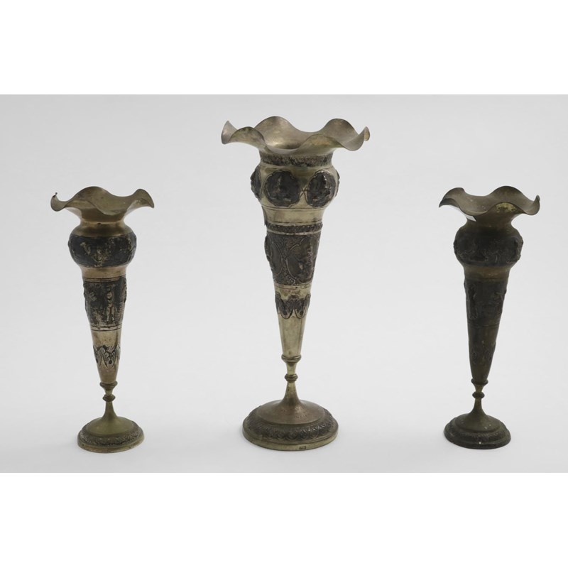 with shaped rims and chased decoration, the larger one with an inscription on the foot, unmarked, early 20th century; the latter 10" (25.5 cms) high; 16.9 oz (3)
