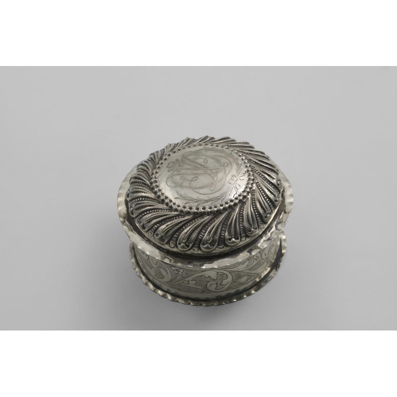 AN ENGRAVED CIRCULAR BOX with an embossed cover & crimped borders, engraved with a large cypher, struck with two marks: "F" and "HI" or IH", unascribed, probably German, early 18th century; 3.5" (9 cms) diameter; 3.45 oz