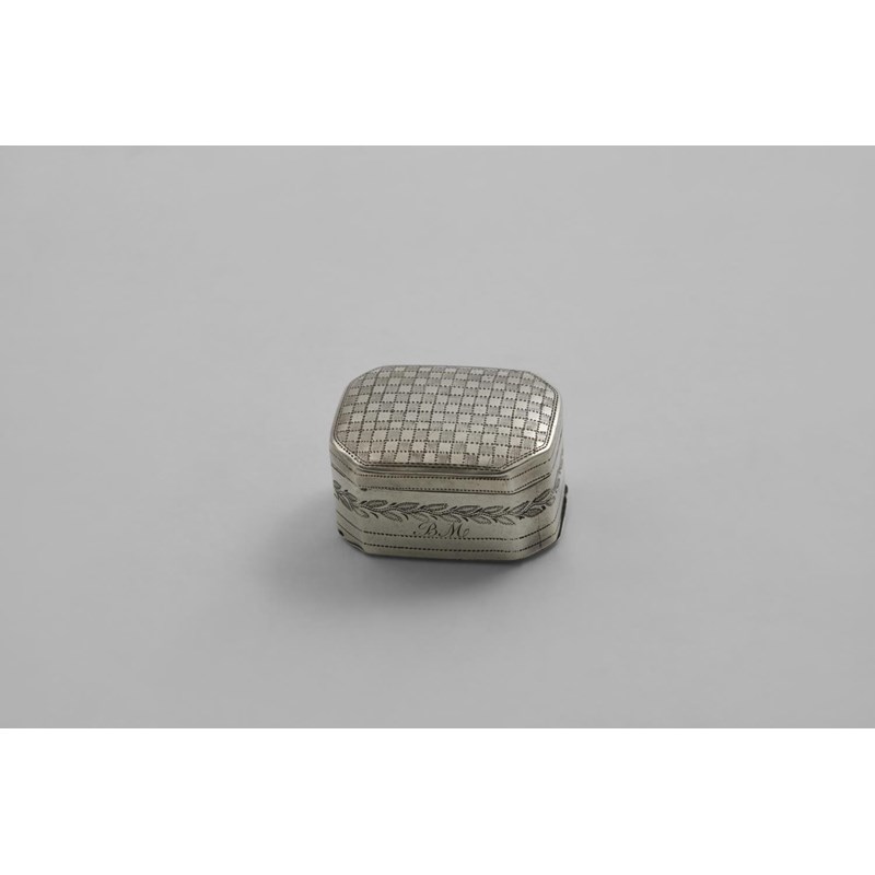 A GEORGE III ENGRAVED NUTMEG GRATER rectangular with cut corners, a hinged cover and a hinged base, by Samuel Pemberton, Birmingham 1808; 1.5" (3.8 cms) long; 0.75 oz