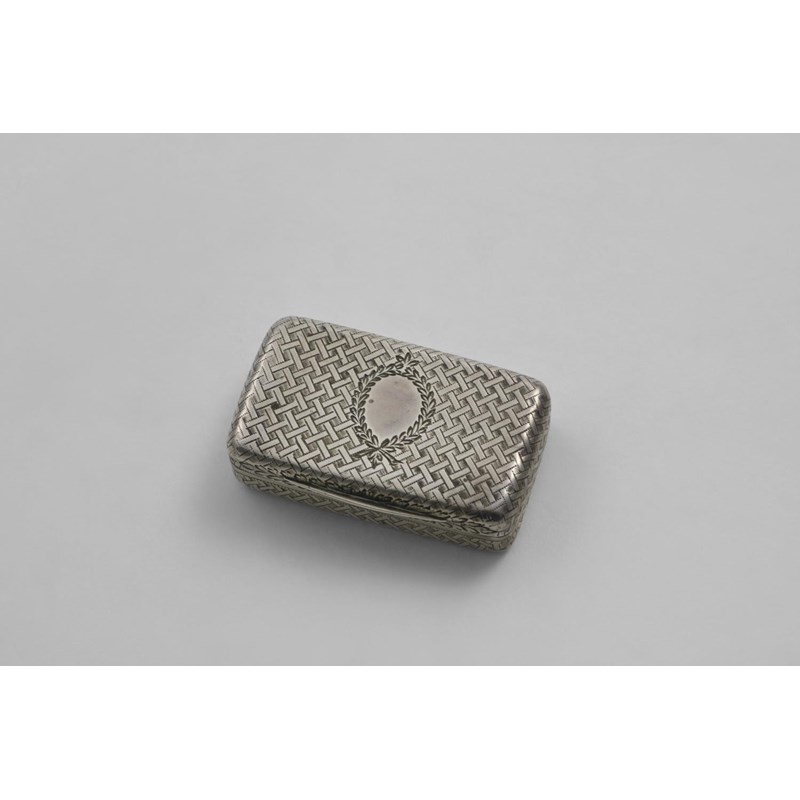 A GEORGE IV ENGRAVED SNUFF BOX rectangular with rounded corners and a trelliswork pattern with a vacant wreath cartouche on the cover, gilt interior, by Lesdam & Vale, Birmingham 1823; 2.2" (5.5 cms) long; 0.95 oz