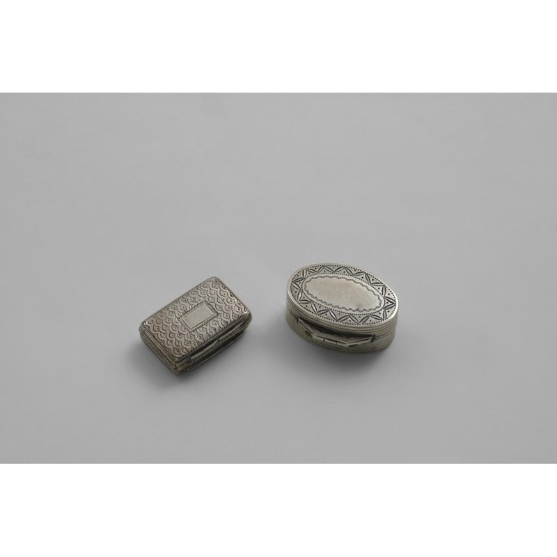 with engraved borders, the grille with birds and a basket of flowers, by William Pugh, Birmingham 1802 and a small engraved oblong vinaigrette by Thomas Shaw, Birmingham 1824; the latter 1" (2.5 cms) long; 0.65 oz (2)