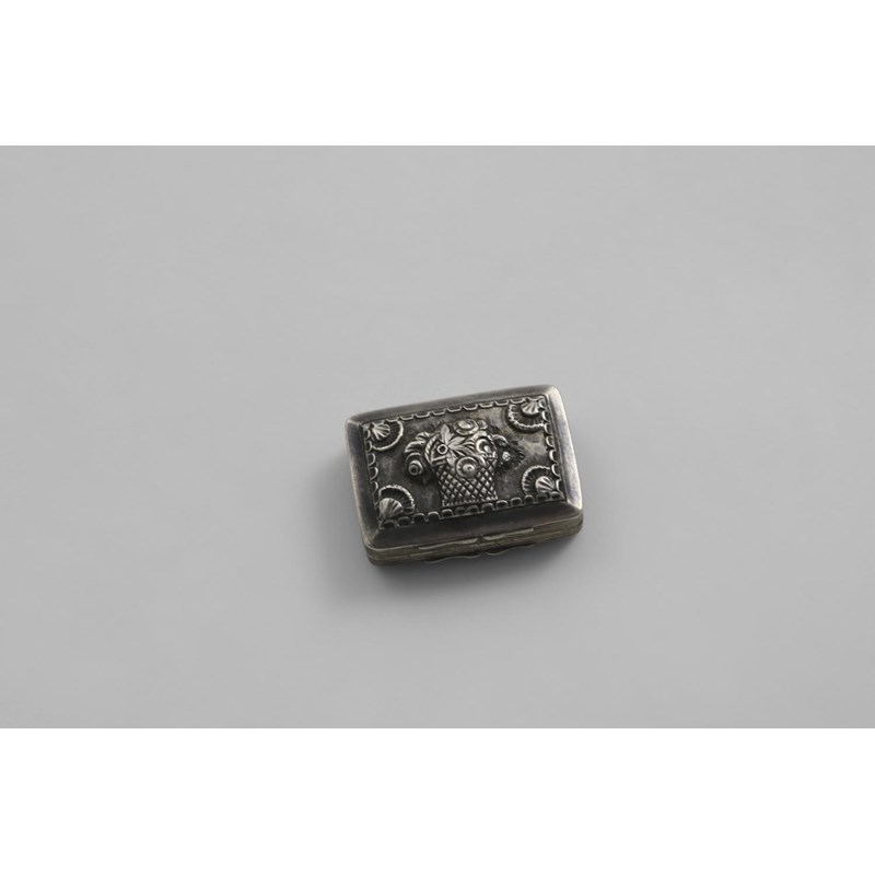 chased on the cover in relief with a basket of flowers, reeded sides & gilt interior, by John Bettridge, Birmingham 1824; 1.25" (3.1 cms) long; 0.4 oz