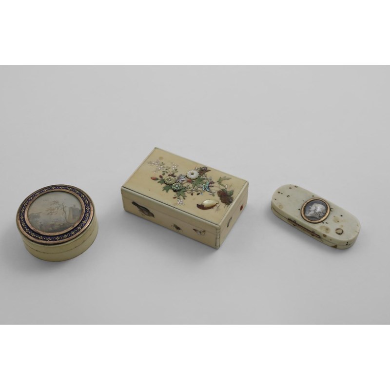 rectangular decorated with flowers, birds & insects, together with an early 19th century ivory toothpick box with inset cameo portrait and gold mounts, and a gilt metal & enamel mounted ivory box & cover, circular with a miniature landscape painting on the cover & a tortoiseshell lining; the latter 2.5" (6.5 cms) diameter (3)